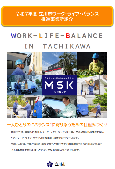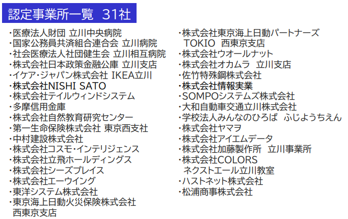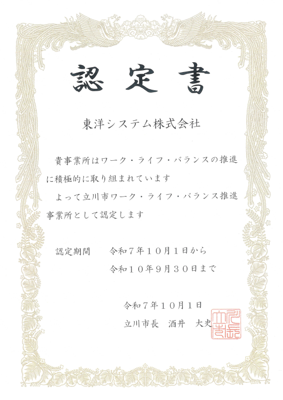 当社は、「立川市ワーク・ライフ・バランス推進事業所」に平成31年度認定され、令和7年更新認定となりました。
